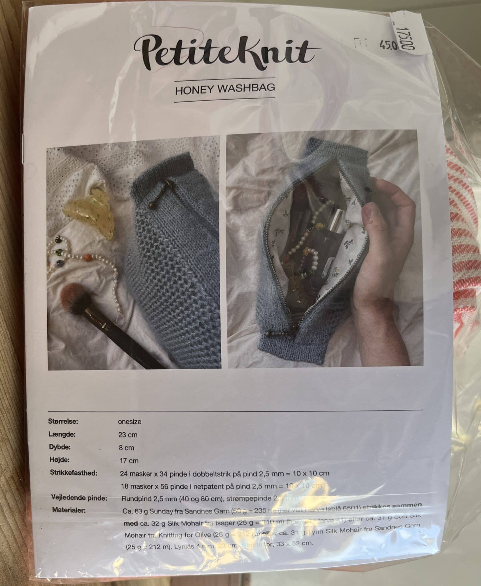 Dette kit er til Honey Washbag fra PetiteKnit. Kittet indeholder garn opskrift, for og lynlås